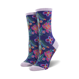 Don your Laurel Burch Alyssa Floral socks and let your feet feel like they're frolicking through a vibrant garden! These crew socks for women are a burst of color with their purple base adorned with pink, orange, yellow, and blue flowers, green leaves, and green and brown vines. The gray toe and heel add a touch of sophistication, making these socks perfect for any fall occasion.