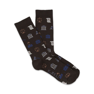 Show off your knowledge for criminal law and fancy courtroom suits. These cool socks will have you looking so good, you might get sued! This pair of all black crew socks features an all over pattern of common legal icons in different colors. This court is adjourned!