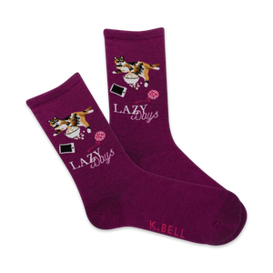 These Lazy Days socks are purrfect for any cat lover. Featuring a pink bowtie wearing kitty cat lounging on a soft pink pillow with a ball of yarn and pink telephone nearby, these crew socks will have you feeling relaxed and cozy. So put your paws up and enjoy some lazy days in style.