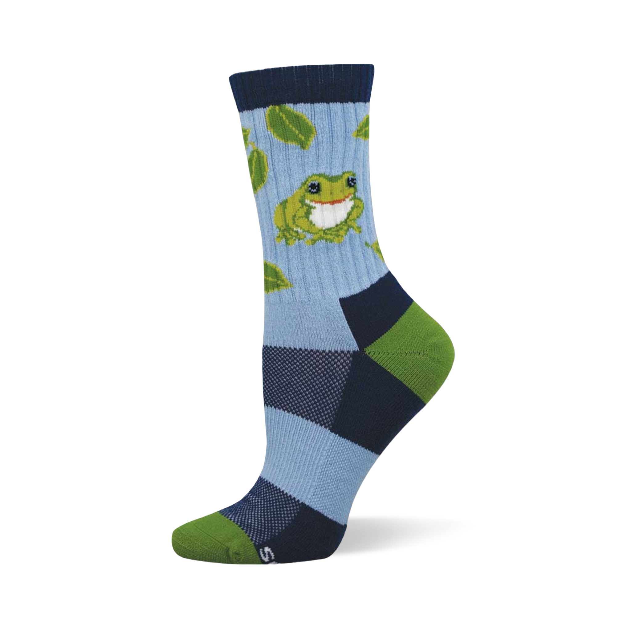 A bright little frog sits front and center on these women's crew socks, surrounded by scattered leaves and a patchwork of color that feels playful without trying too hard. The design has a cheerful, slightly cartoonish charm, the kind that makes people glance down twice and smile. It is the sort of pattern that brings a bit of pond-side whimsy to an everyday outfit, whether you wear it with sneakers, boots, or your favorite casual shoes.