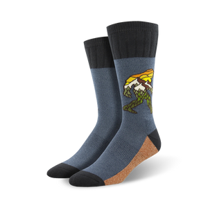 We've heard of "leave no trace" but what does it mean to "wear no trace"? When you slap on a pair of these crew length dark blue socks with a brown toe and heel and black cuff, you'll be hiking in the woods with a green and yellow Bigfoot carrying a yellow sunset on his shoulder. Cool, comfortable, and crazy stylish. No one will know you've got socks on until you take your shoes off! Even dirt can't resist the pull of the outdoors so wear these "Leave No Trace" socks on your next hiking adventure