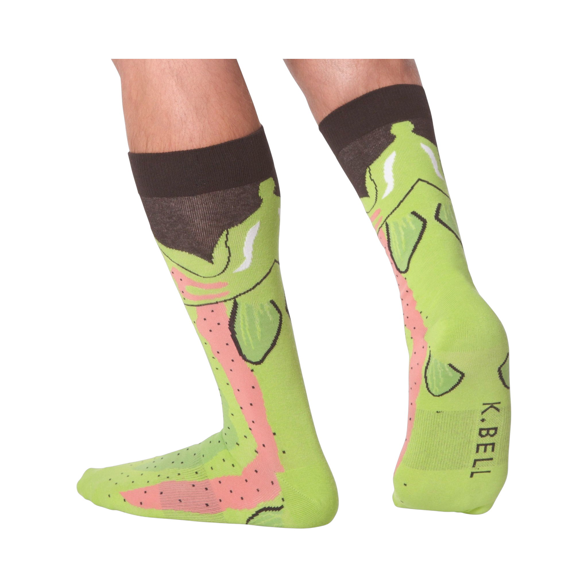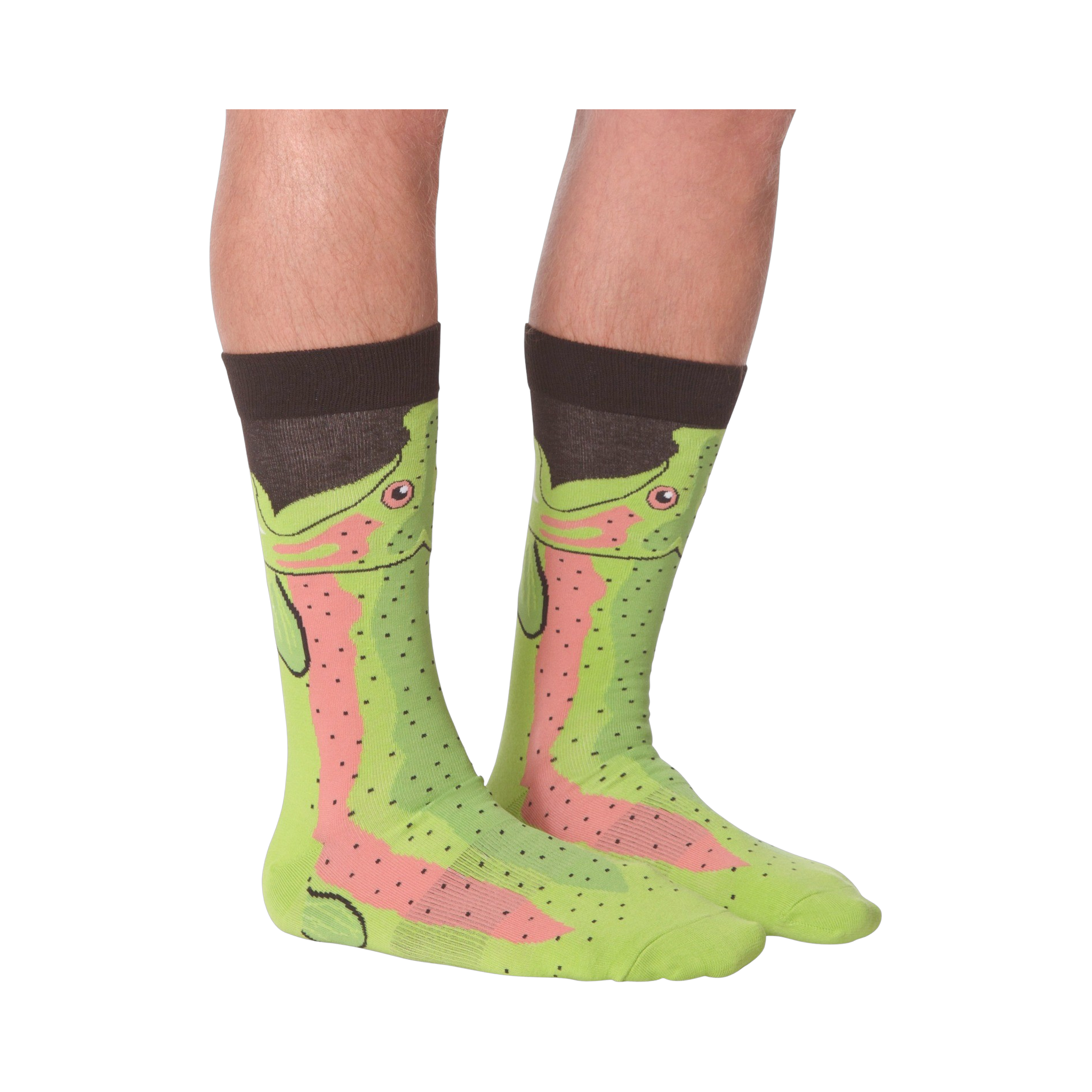 Kick your fishing game up a notch with our "Leg Eater Trout" socks! Featuring a vibrant green backdrop with a shoal of trout sporting cheeky pink mouths and mischievous black eyes. The brown toes and heels add a touch of rugged charm, making these socks the perfect catch for any fishing enthusiast. 🎣 🥾 💦