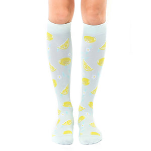 Walk on the sunny side of life with our Lemon-printed knee-high socks! Step into a world of citrusy charm where cheerful yellow lemons and delicate white flowers dance across a cool blue backdrop. Brighten up your day with these fun socks and bring a smile to everyone's face. Trust us, these lemons aren't sour, they're sensational!