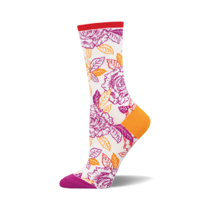 Brighten your sock drawer with a touch of sassy charm! Our Lesbian Roses novelty socks burst with a lively pattern of orange and purple roses against a crisp off-white background, punctuated by a bold red cuff and playful purple accents on the toes and heels. Perfect for festivals, casual brunches, or just lounging around, these crew-length socks add a flair of fun to any outfit. Ready to blossom in your footwear collection, why not let your feet show off their petal power?