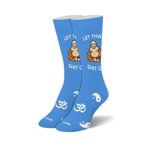 When life gives you lemons, put on your Buddha socks and tell it to, "Let That Shit Go." These electric blue, ultra-comfy, extra-fun socks are covered with a crew of cartoon Buddhas sitting in lotus position. Each little Buddha has his eyes closed in blissful meditation. Look closely, and you'll see "Let That Shit Go" spelled out in white letters on the ankle. Turn the socks over, and you'll spot an ohm symbol and a yin yang symbol on the bottom. With their bright colors, playful design, and hilarious message, these novelty socks are the perfect way to add some fun to your everyday wardrobe, channel your inner Zen, and stay positive, no matter how sour life gets.