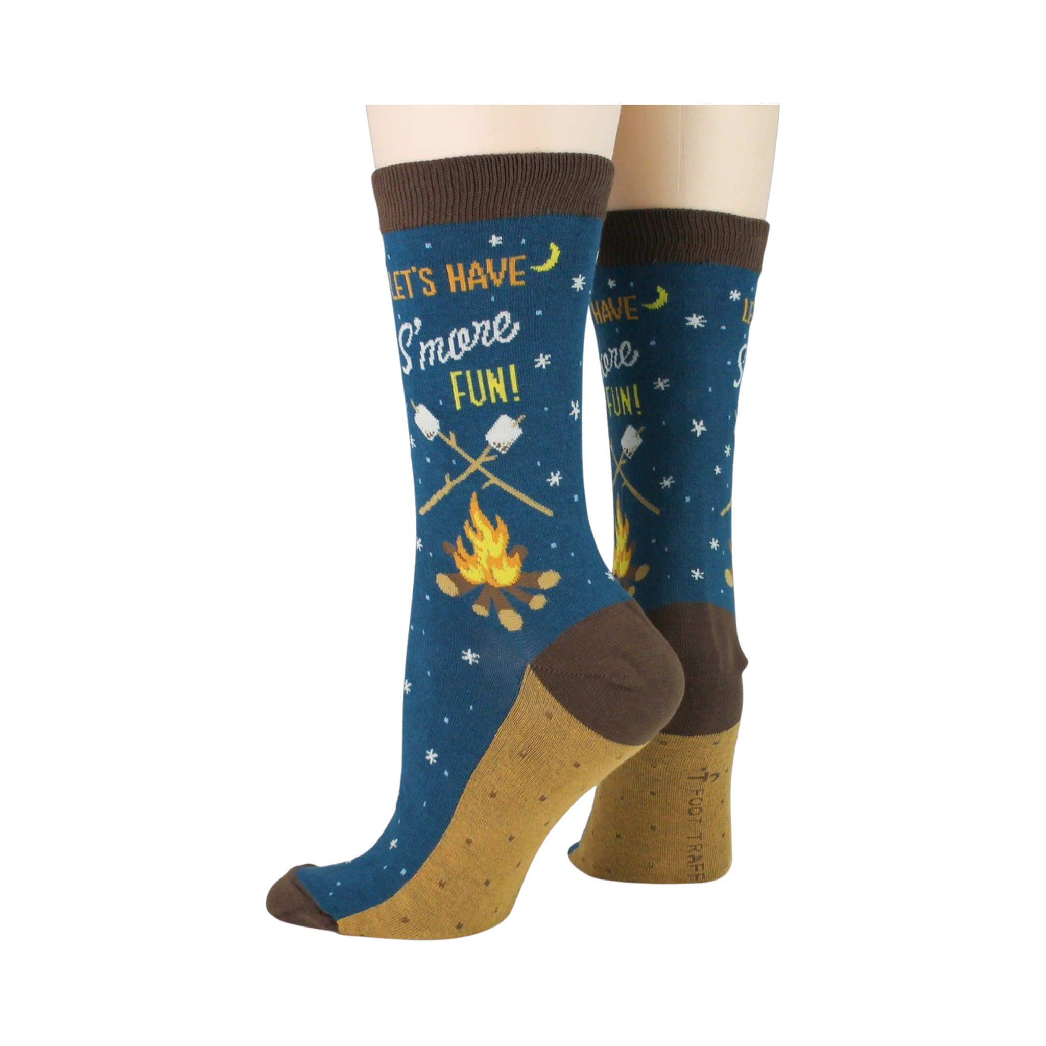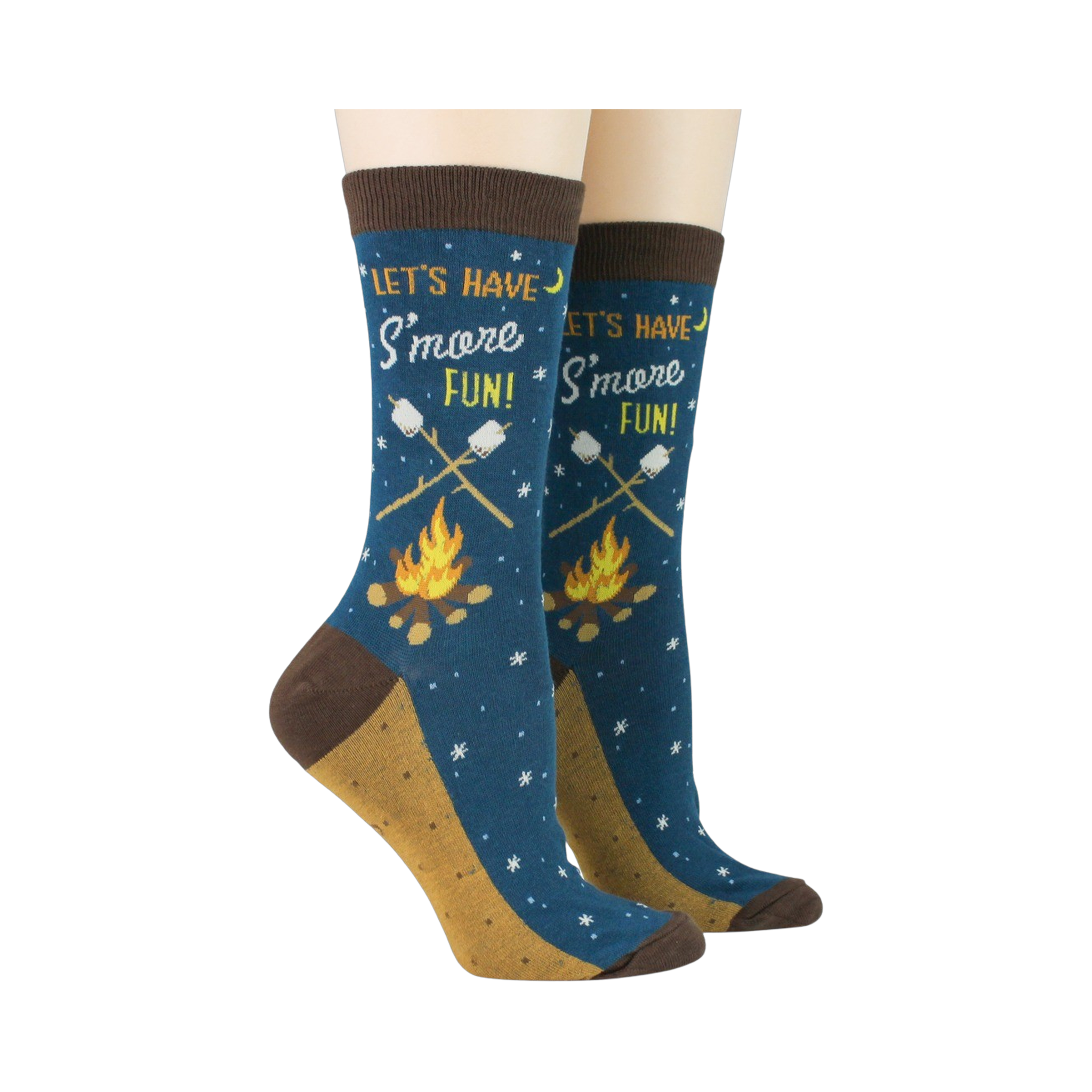 For the person who likes a little whimsy with their wardrobe, these women's crew socks bring the whole campground to your ankles. The design sets up a cozy night scene with crossed roasting sticks, a bright campfire, and a sweet nod to everyone’s favorite fireside snack. It feels playful without trying too hard, the kind of pair that makes people look down, smile, and ask where you found them.