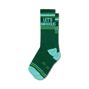Cuddle up with Let's Snuggle socks! These socks are dark green with blue and light green stripes and "Let's Snuggle" in white. Sure to bring a smile to your face, these socks are a reminder of cozy times and furry friend hugs wherever the day takes you. Wear them while you snuggle up watching a movie, or to keep your toes cozy while you work. They're perfect for men and women, so you and your honey can wear matching socks!