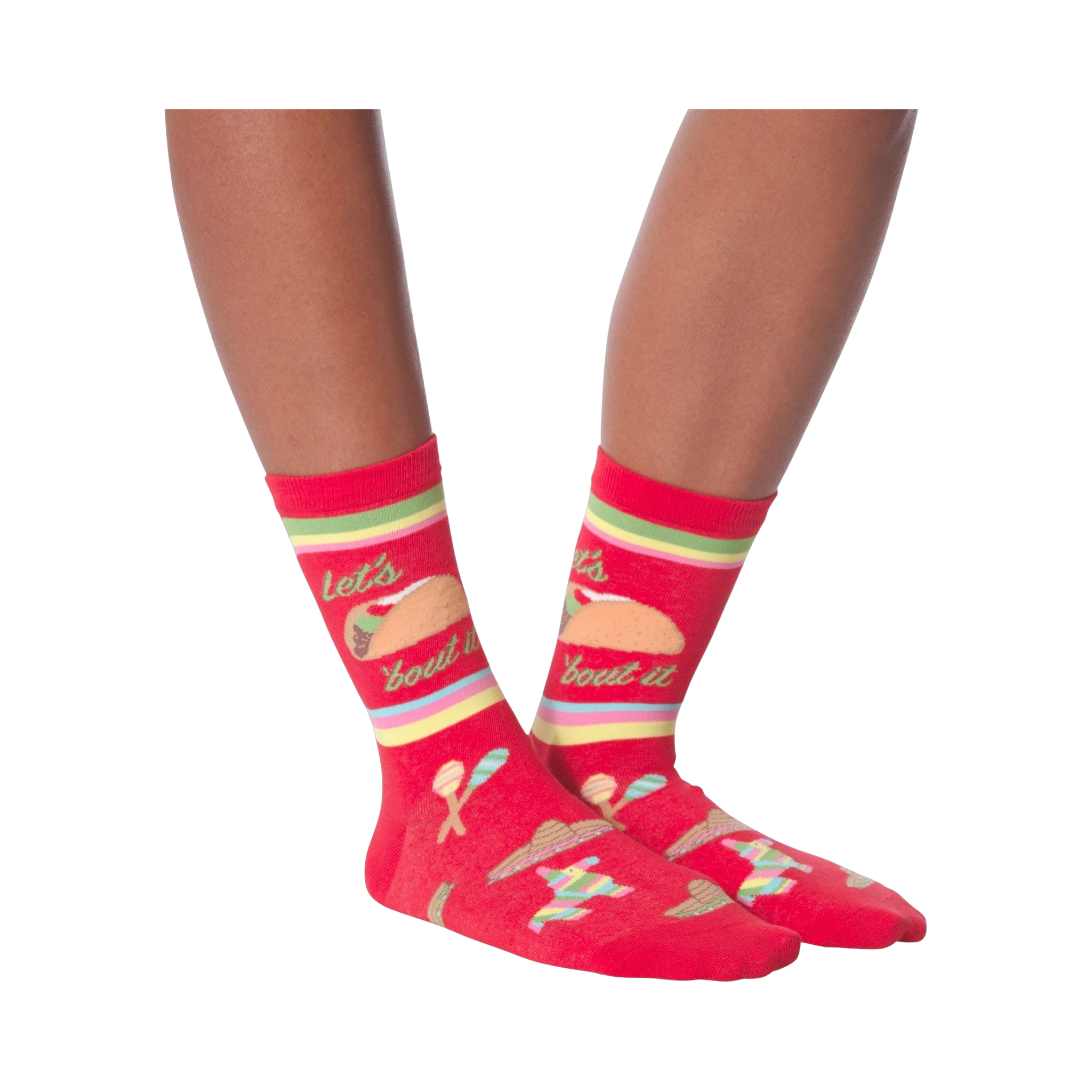 Feelings sometimes run as deep as the melted cheese on a taco shell. No one said life would be easy. Pull up a chair, let's taco' bout it. These funny socks features the fun phrase surrounded by colorful stripes, maracas, and sombreros. Add these cool feet warmers to your collection of taco lovin' outfits.