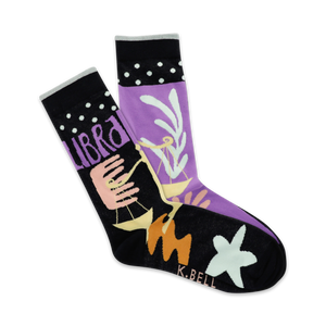 In the realm of socks, Libra shines with cosmic elegance. Dance through life's adventures with these black beauties, adorned with a celestial Libra symbol, scales held by a mystical pink and orange hand, and a vibrant bouquet of blooming flowers. Let your feet proclaim your starry destiny, one step at a time.