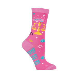 Has anyone ever told you, you have the right balance of romance and self-sufficiency? We bet you hear that a lot! Let the world know your star sign with these playful novelty socks. Each pair of pink crew socks features a print of stars, hearts, and the planet Venus with the Libra symbol above the ankle.