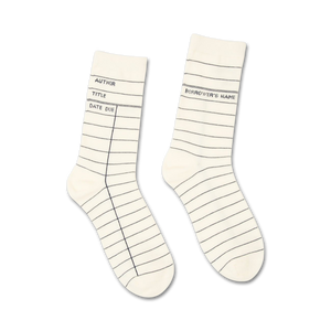 Get your feet into a set of Library Card White socks and let the black lines take you on a literary adventure! The crew length socks are perfect for kicking back with a good book. Your literary adventure is waiting. Get your feet comfy with these cotton crew length socks.