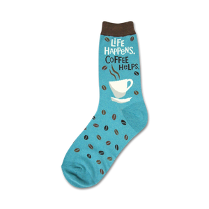 Life happens, Coffee helps! And when life gives you lemons, wear these fun blue crew socks featuring a white coffee cup with brown coffee beans. You got this!