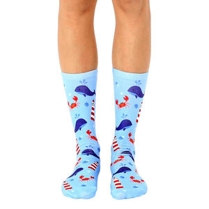 Set sail for adventure with our Lighthouse Whale Crew Socks! Dive into a vibrant blue sea of lighthouses, whales, and crabs, sure to brighten up any dull day. Whether you're a beach bum, ocean lover, or just want to add a touch of nautical charm to your wardrobe, these socks will have you riding the waves of style. Show off your love for the sea and make a splash wherever you go.