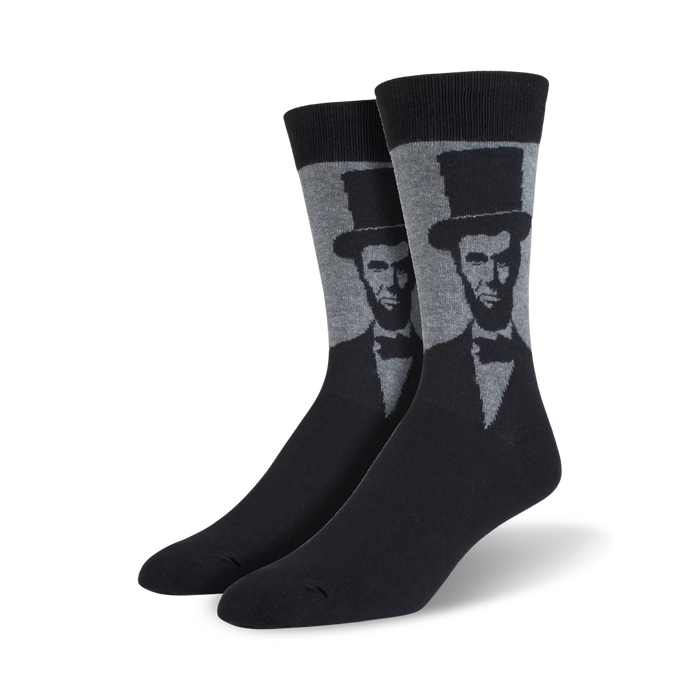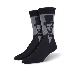 Show off your love for history by wearing some fun novelty socks depicting the 16th president of the United States! Each presidential pair of all black crew socks features a monochrome image of Abraham Lincoln. He is wearing his iconic top hat and suit. Nothing wrong with being a history buff.