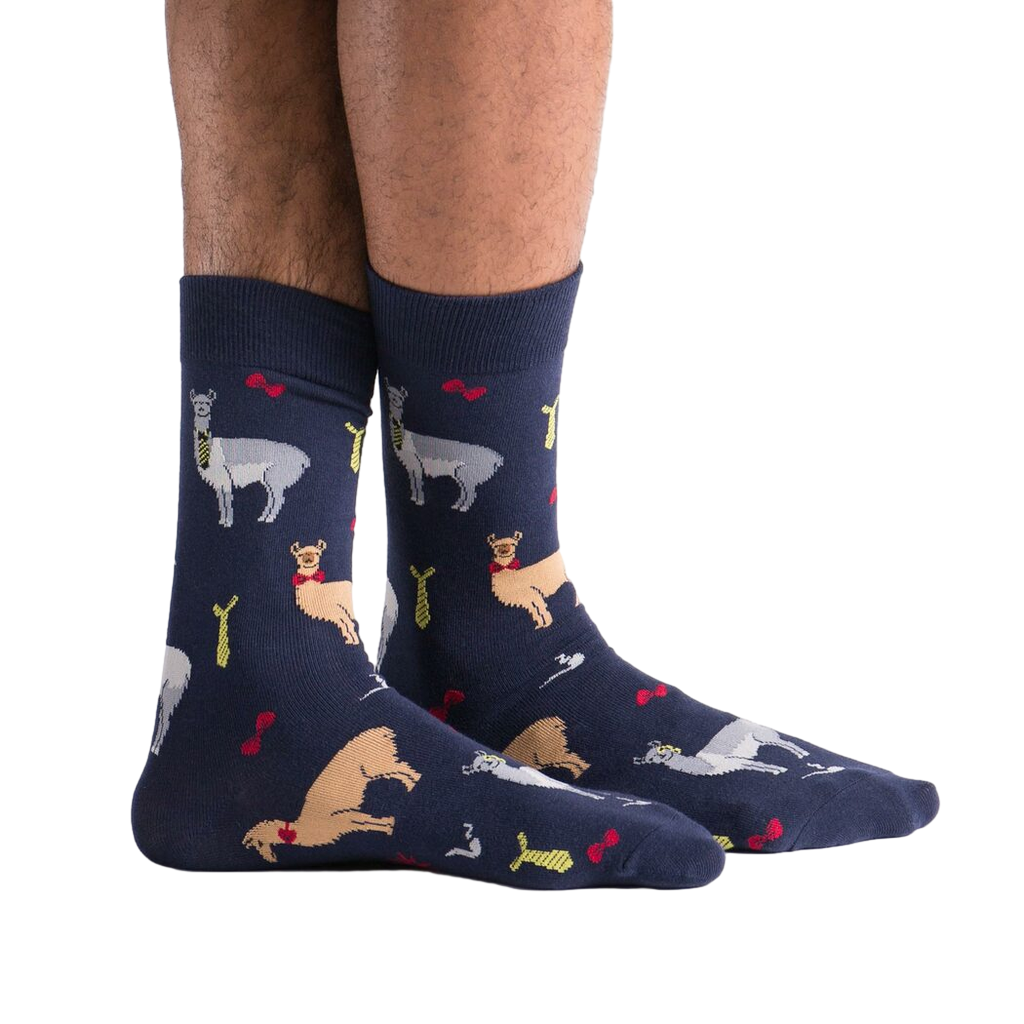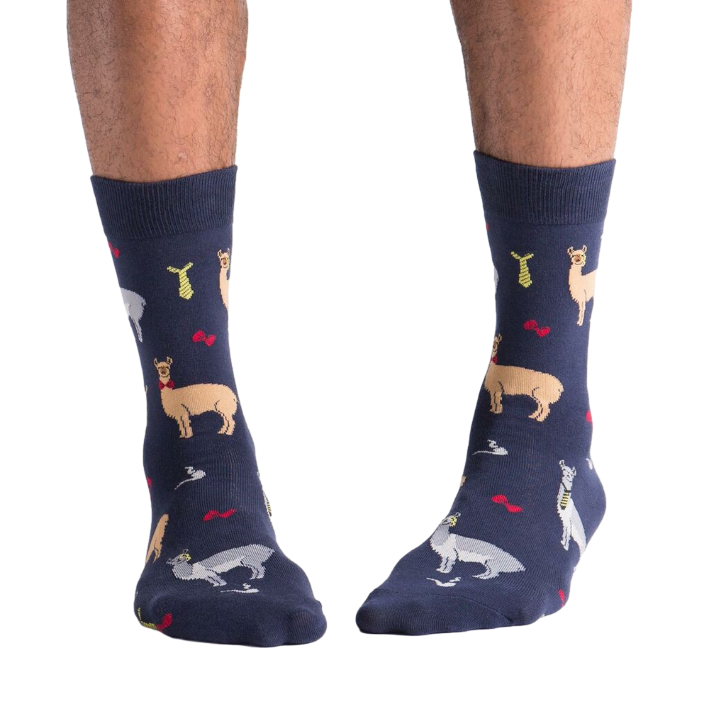 Llama Drama Crew Socks: Bring the drama to your feet with these navy blue socks featuring llamas wearing dapper bow ties. These socks are sure to turn heads and spark conversations wherever you go. Fun Fact: Llamas can't spit like camels, but they do make a strange humming sound when they're feeling annoyed. So, next time you're feeling a little dramatic, slip on a pair of Llama Drama socks and embrace your inner llama!
