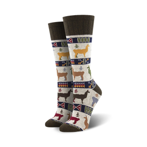 Llama Out of Here Wool! These white crew socks with a brown cuff feature a fun pattern of llamas in various hues and geometric shapes in vibrant shades of red, orange, yellow, green, blue, and purple. Put on a pair of these llama-themed socks for men and women the next time you need a reminder to keep it chill and llama out of here!