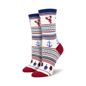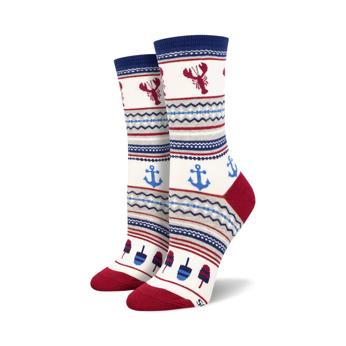 Cruise on over to our Lobster Fair Isle Women's Crew Socks with a festive nautical theme. Dive right into the deep blue stripes and red lobster pattern with anchors and popsicles. These vibrant blue, red, and white socks will complete your summer outfit with a nautical flair!