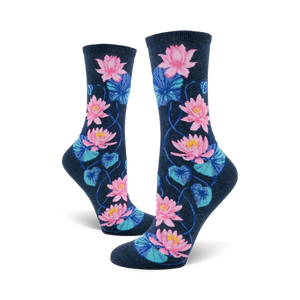 These dark blue Lotus Flower socks are blooming with funky pink and blue flowers. Each flower has a unique pattern with multiple petals. And the pointed green leaves complement the floral pattern and bring it to life!