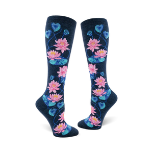 Lotus blossoms floating on a dark blue river of dreams, these knee-high socks are a wearable garden of serenity. With a pretty pattern of pink and blue blooms, the Lotus socks are a cheerful pop of color for your feet. Flowers are nice, but Lotus socks are fabulous!