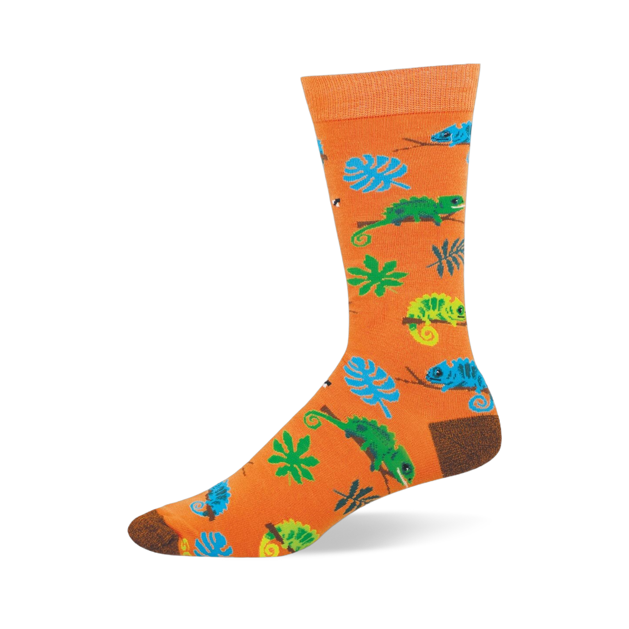 These men's crew socks bring a little rainforest personality to the everyday routine. Bright chameleons cling to branches among leafy accents, creating a playful scene that feels curious and just a bit mischievous. The bamboo-inspired theme gives the design a natural, easygoing feel, while the vivid animal pattern keeps it from blending quietly into the background.