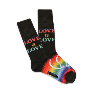 Show off your love for love with these beautiful Love Is Love Crew Socks! Their 100% cotton design features comfy black socks with rainbow-colored lettering and a peace sign on the toes. Let these socks remind you that love has no boundaries and everyone deserves to feel loved and accepted.