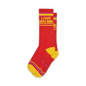 You know those red socks with yellow toes, heels, and cuffs that say "Love Machine" in purple letters? Well, slip into these crew-length socks and let your feet do the talking! You'll be the life of the party with these funny socks, spreading love and good vibes wherever you go. Just remember, these socks are made for men and women, so don't be afraid to share the love!