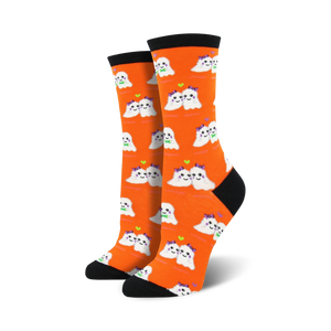 Love You Boo! Spook your feet with these super fang-tastic socks featuring cute and cuddly ghosts. These haunting socks feature an adorable pattern with purple-eyed ghosts and purple hearts floating on an orange background. The perfect gift for any ghoul or guy this Halloween, these socks with their colorful ghost pattern will bring a smile to the face of any friend or family member who loves Halloween and puns!