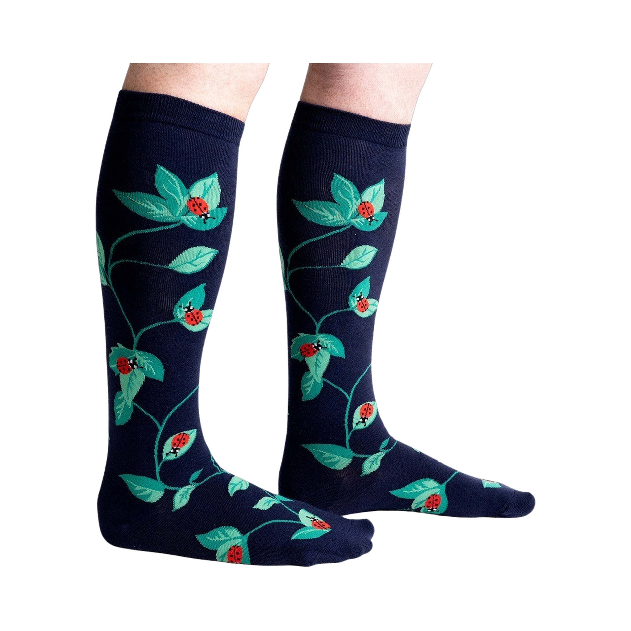 Did you know that ladybug larvae eat aphids? That's so metal! Show off your encyclopedic knowledge of all things buggy with these aptly named Luck Be a Lady Bug Knee Highs. The dark blue socks are covered in a pattern of vibrant red ladybugs and verdant green leaves that are sure to turn heads everywhere you go. Just try to resist the urge to pet your ankles!