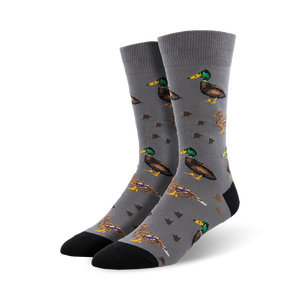 Got the blues? Duck it! Lucky Ducks are cheerful socks that'll turn your feet into a quacking-good time. Our socks are pretty fly -- just ask the ducks who are swimming, standing, or flying on a gray background. And like all ducks, they love a good adventure! Wear these crew socks while you waddle through life. Your feet will enjoy our soft cotton material too. Our socks will make you smile and people around you quack up!