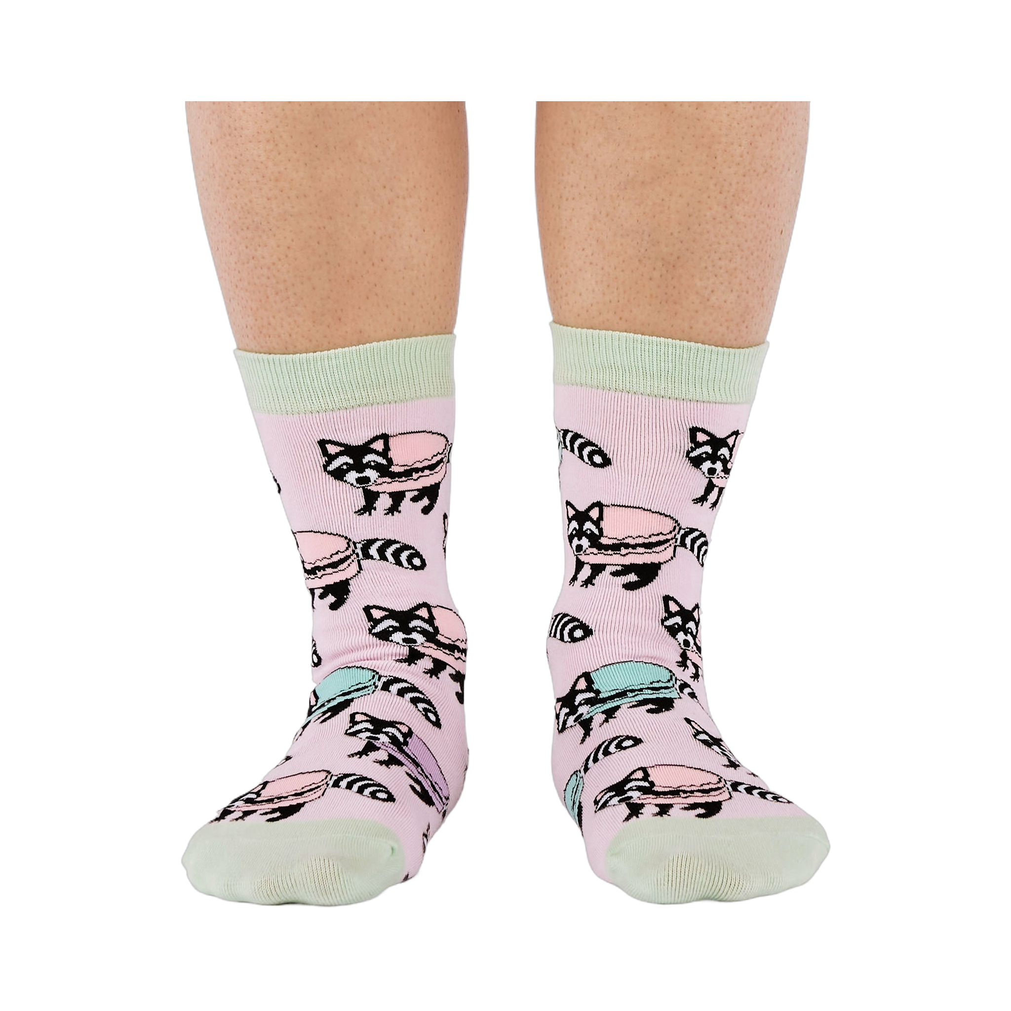 Macaraccoon crew socks bring a sweetly absurd twist to everyday dressing, with little masked raccoons dressed up like macarons and scattered across the pair. The playful repeat pattern gives the socks plenty of personality without feeling loud, and the women’s crew style makes them easy to wear with sneakers, loafers, boots, or a favorite pair of rolled cuffs.