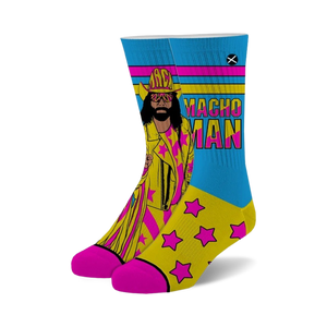 Macho Man Stars Socks: A stellar tribute to the iconic WWE superstar. Featuring a cartoon version of the Macho Man Randy Savage, these vibrant blue and yellow socks with pink toes, heels, and tops are sure to make you feel like a champion. Blast away boredom and light up your day with these show-stopping Macho Man socks.