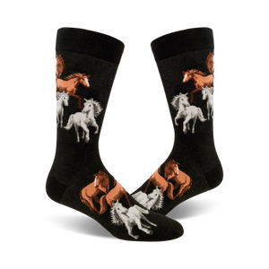 Giddy up! Ride a wave of fun with our Majestic Horses socks. Featuring a crew length of four different breeds, galloping across a black backdrop, these socks will make you want to saddle up and gallop into adventure. With five horses per sock, you'll have a mini herd on your feet! Put these on and let the good times neigh-ver end. Fun fact: Did you know that horses can sleep both standing up and lying down? Now you can show off your knowledge while rocking these equestrian-themed socks!