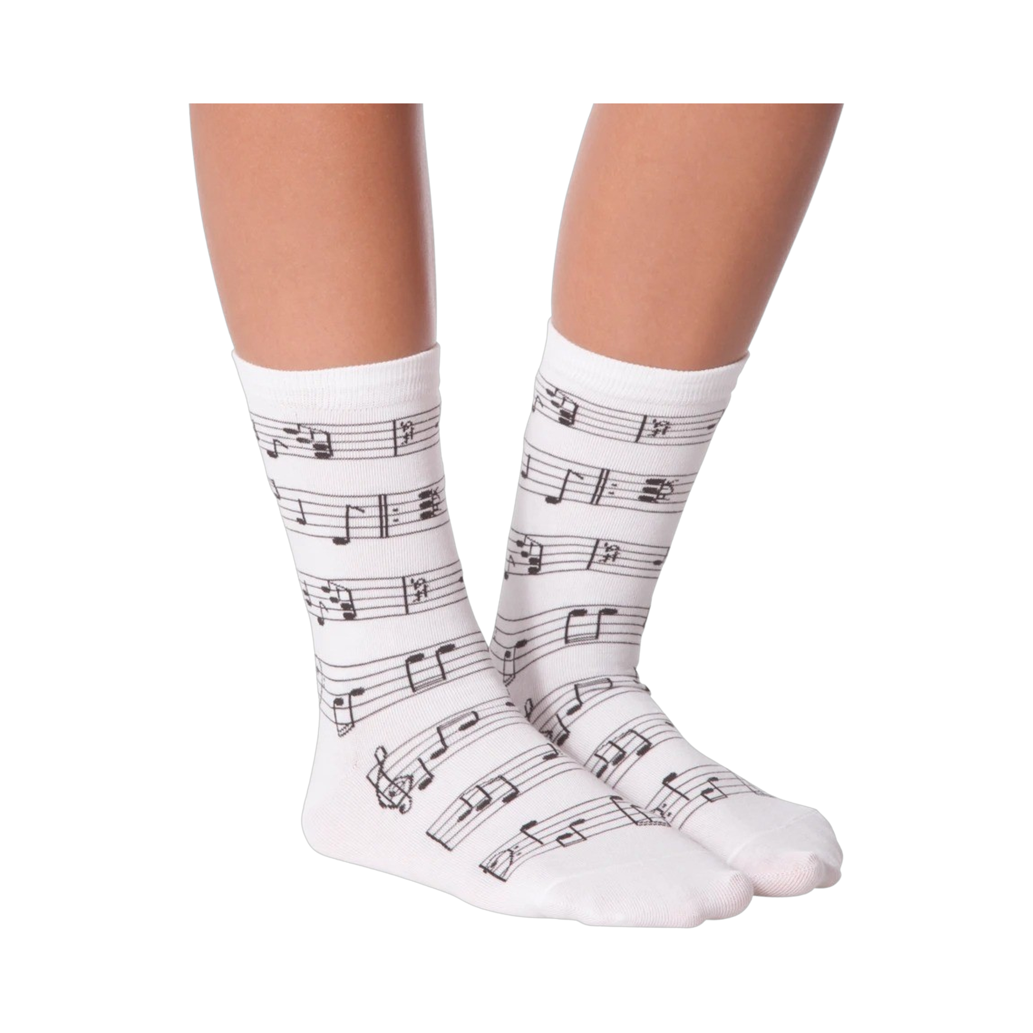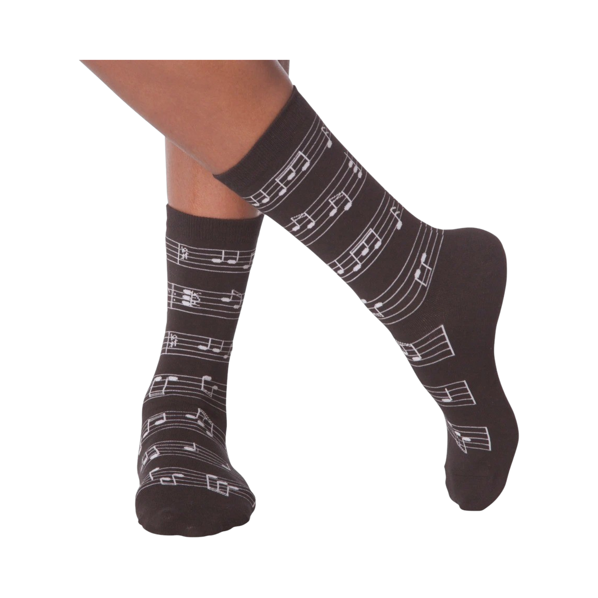 Make sweet music with every step you take throughout your day! This fun pair of all black crew socks will have you finding the perfect harmony. Each sock features an all over music sheet print in white. If you are a lover of making music or just a fan of listening to it, these awesome socks will have you majoring in every letter.