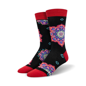 Say goodbye to boring sock days and slip into Mandala socks, the colorful and inspiring way to make your feet unique! These socks feature a vibrant mandala pattern in red, blue, green, yellow, and purple, showcasing a harmony of colors and precise patterns. The vibrant design will surely captivate everyone's attention. These funky socks will add a splash of fun and personality to any outfit, making your feet the center of attraction.