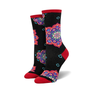 Get lost in the beauty of these black crew socks featuring colorful floral mandalas. These socks are sure to turn heads with the intricate designs. They make an excellent reminder that even the smallest designs can be incredibly intricate.