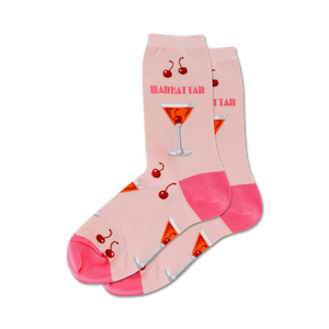Ready to stir up some fun? Slip into these Manhattan Cocktail Crew Socks for Women and let the party begin! Featuring a vibrant pattern of pink cocktail glasses filled with a cherry-red liquid, these socks are sure to be the life of any gathering. And with cherries scattered throughout, you'll be the cherry on top. So grab a pair and let the good times flow!