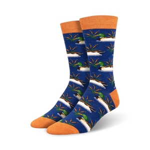 Calling all duck lovers! Get ready to quack up with our Many Mallards Bamboo socks! These crew length socks are a wild adventure, featuring a pattern of green and orange mallards swimming in a pond surrounded by tall grass and a bright blue sky. With an orange toe and heel and a blue cuff, these socks are sure to make a splash wherever you go!