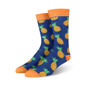 Not only do pineapples taste good, but they are also good for you too! Get a healthy dose of dietary fiber and vitamin C when you eat this tasty fruit. If you are a big pineapple lover, these fun men's novelty crew socks belong in your sock drawer. Each refreshing pair features pineapples printed all over against a blue background. The cuffs, heels, and toe lines come in an attractive orange hue.