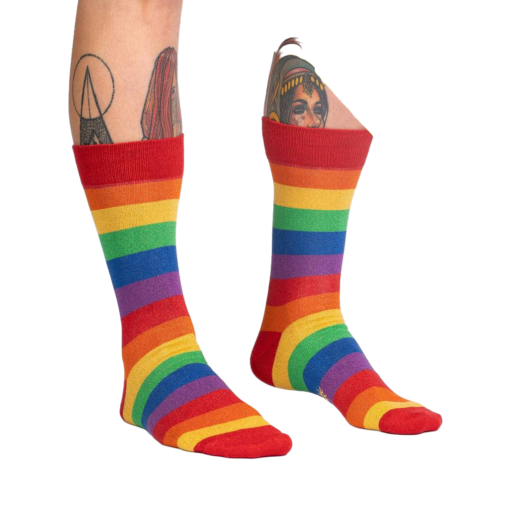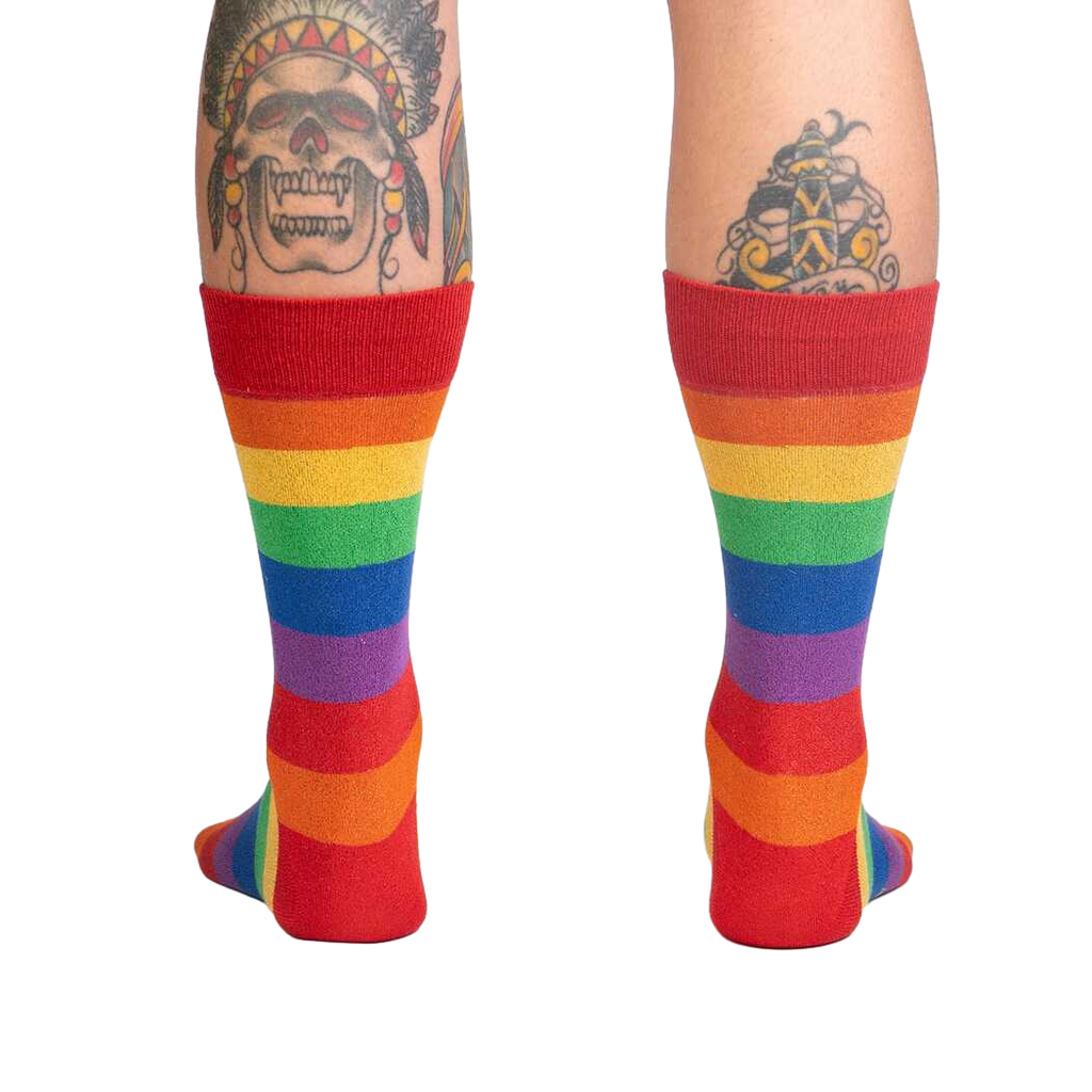 Strut your stuff with your pride and joy on display in these March with Pride Crew Socks! Featuring a vibrant, repeating rainbow stripe pattern in red, orange, yellow, green, blue, and purple, these festive socks are perfect for celebrating diversity and advocating for equality. The comfortable, unisex design ensures a great fit for both men and women. So, step up, show off your true colors, and make a statement with every step you take in the March with Pride socks!