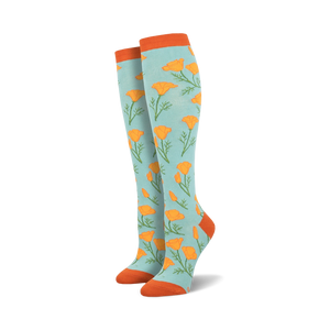 Calling all landlubbers and seafarers! Our Maritime Poppies knee high socks are blooming with orange poppies against a light blue sky of fabric, complete with green stems and leaves. With these poppies on your feet, you'll leave footprints of cheer wherever you go. Why orange poppies? Well, did you know orange poppies represent beauty and success? Time to set sail with some sunny style.