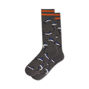 Marlin magic in your kicks! Slip into these gray crew socks for men and let the vibrant blue marlins leap off your feet. Whether dashing through the depths of your daily grind or just kicking it at home, these socks will have you hooked!