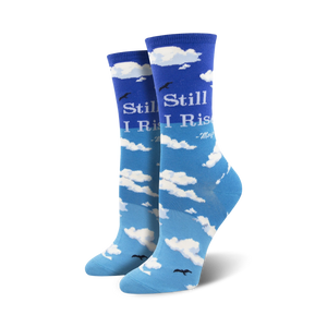 Maya Angelou Still I Rise Socks: Fly high like Maya Angelou in these inspirational crew socks for women. Featuring a vibrant pattern of white clouds, black birds, and the words "Still I Rise" in bold lettering, these socks are a reminder to keep rising, no matter the obstacles. Made with a cozy blend of materials, these socks will have you soaring with style and comfort. Put on a pair of Maya Angelou Still I Rise socks and let your spirit take flight!
