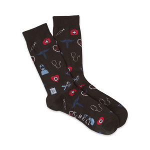 Unlock a fresh dose of medical cheer with these dark brown socks splashed with red and blue accents. Let the cheerful parade of stethoscopes, syringes, hearts, and first aid kits on each pair remind you to stay positive and healthy. Ideal for men with a passion for all things medical, these crew-length socks bring a dash of fun and rejuvenation to everyday life.