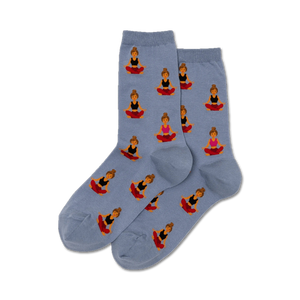 Slip into a pair of these blue crew socks and channel your inner yogi. Featuring a vibrant pattern of dark-haired, dark-skinned, meditating women in red pants and pink tops, these comfy socks remind you that even in the craziest of poses, staying calm and centered is key.