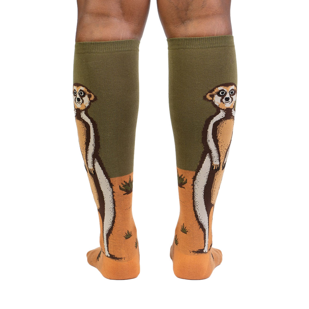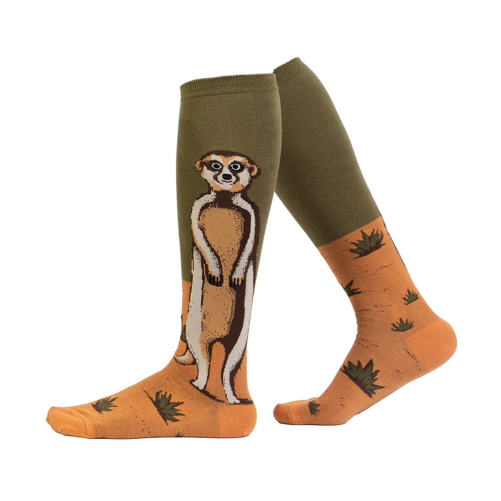 These knee-high socks feature a meerkat standing tall against an orange-and-green background. The visible portion shows a striking illustration of the meerkat, detailed with various shades of brown and white. The olive-green section of the sock transitions to a sandy orange at the bottom, with a small, repeated pattern of green plants. They're comfortable, fun, and guaranteed to add a dash of unexpected whimsy to your day.