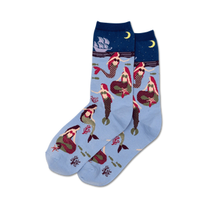 Dive into the whimsical world of mermaids with our Mermaid Crew Socks for women! Adorned with redheaded mermaids frolicking amid green seaweed, starfish, and a distant ship, these socks will transport you to an underwater realm of enchantment. Each step you take will be a splash of color and fun, reminding you of the captivating beauty that lies beneath the waves.