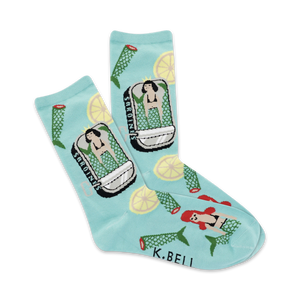 The Mermaid Crew Socks for Women are splashing with fun! These light blue socks feature a charming pattern of mermaids lounging in tin cans, surrounded by vibrant red and orange lemons. Slip into a pair of these whimsical socks and let your feet take a dip in the sea of fabulous fashion. They make a great gift or a delightful treat for yourself.