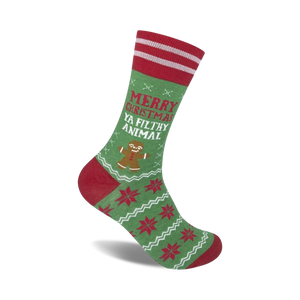 Forget boring socks! Deck your feet out with these festive 'Merry Christmas Ya Filthy Animal' Christmas-themed socks. Featuring red, green, white, and red stripes, these crew socks are made of comfy cotton to keep your feet jolly and warm. Get yourself a pair and let your style jingle all the way!