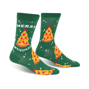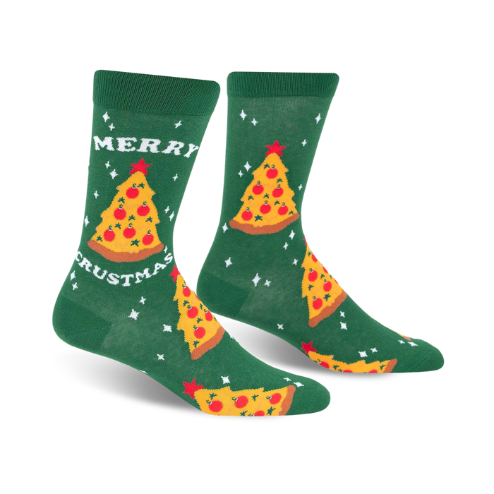 Merry Crustmas socks: The cheesiest Christmas socks you'll ever wear! These festive socks feature a jolly pattern of pizza slices shaped like Christmas trees, complete with pepperoni and a star on top. Scattered snowflakes add to the holiday cheer. Perfect for spreading holiday cheer.