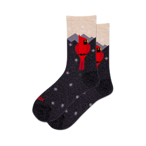 Ever noticed how the vibrant red cardinal stands out beautifully against a winter's night? Our Metallic Cardinal crew socks capture this dazzling scene, featuring these brilliant birds set against a shimmering metallic mountain backdrop. Crafted with love and a sprinkle of metallic magic, these socks are a delightful nod to the wonders of winter—perfect for the bird enthusiast in your life.